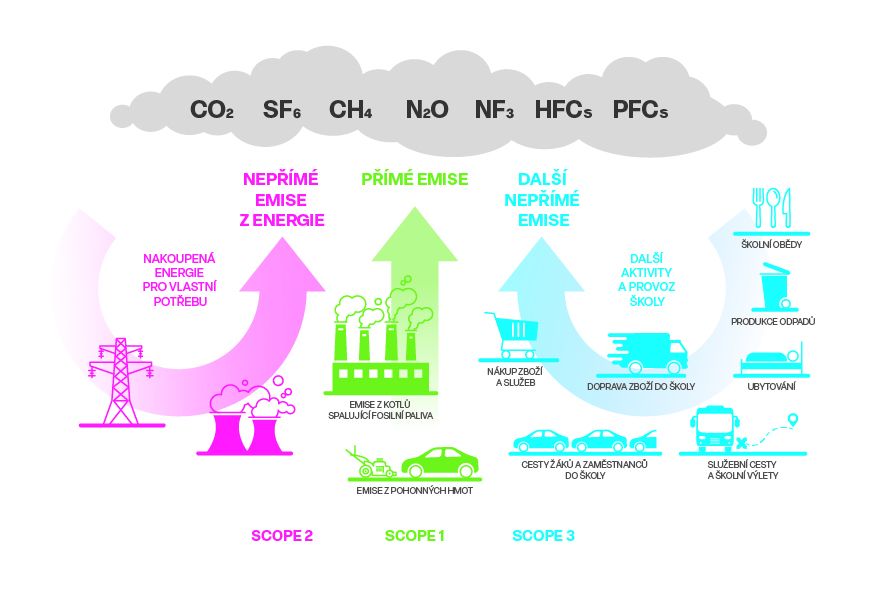 - Scope 1 – přímé emise z aktivit školy (např. vytápění, vlastní vozidla),