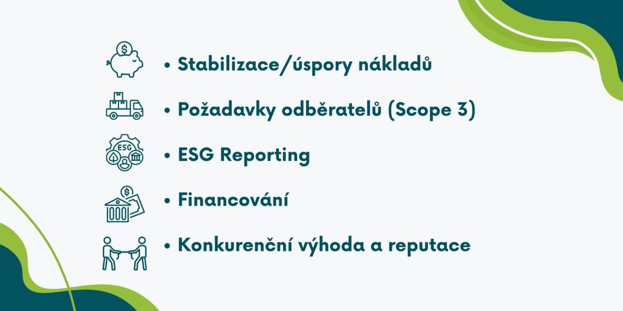 Hlavní motivací bývá dlouhodobá stabilizace nákladů. Investice do energetické účinnosti a obnovitelných zdrojů pomáhají omezit závislost na kolísavých cenách energií a zároveň snižují provozní výdaje. Důležitým impulsem je také rostoucí tlak napříč dodavatelským řetězcem – velké korporace dnes vyžadují od svých dodavatelů údaje o uhlíkové stopě, které se započítávají do jejich vlastních Scope 3. Zároveň se tento tlak postupně rozšiřuje napříč dodavatelským řetězcem, protože firmy, které chtějí zůstat součástí stabilních obchodních vztahů, musí být schopné doložit svá data a snižovat emise.